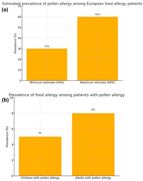 The correlation between the prevalence of food allergies and pollen allergies [2]. (a) Estimated prevalence of pollen allergy among European food allergy patients. (b) Prevalence of food allergy among patients with pollen allergy.