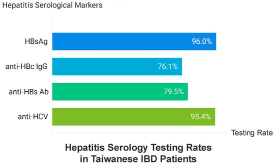 The prevalence of HBV infection differs significantly globally. Approximately 5% of the population in highly endemic regions, such as Southeast Asia, the Western Pacific, and Africa, has hepatitis B, whereas the prevalence in Europe and the Americas is approximately 1% [32]. The widespread vaccination program has reduced the prevalence of HBV infection [33,34]. However, the status of hepatitis B/C infection in regions with a low IBD incidence but a high hepatitis incidence, such as Taiwan, is less understood [35]. A previous study reported anti-HCV seropositivity in 6.8% of individuals with diabetes mellitus (DM), compared to 2.6% in the general population [36]. However, the prevalence of HCV and HBV infection among patients with inflammatory bowel disease (IBD) remains unclear. This information is clinically important, as patients with IBD receiving immunosuppressive therapy may be at increased risk of hepatitis reactivation. Notably, safe and effective antiviral therapies are currently available for both hepatitis B and C infections.
