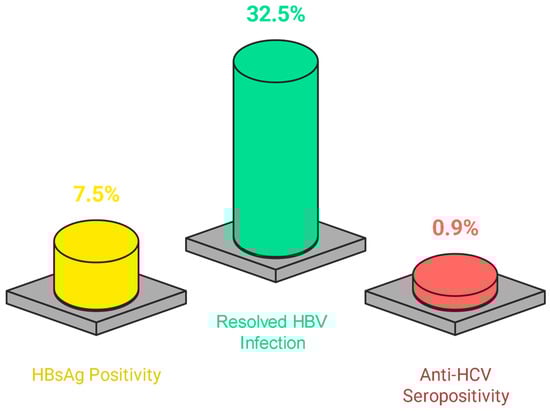 Data on age, gender, date of diagnosis, and serological markers for HBV, including HBsAg, anti-HBs Ab, and anti-HBc IgG, as well as HCV markers, specifically anti-HCV, were collected from all patients.
