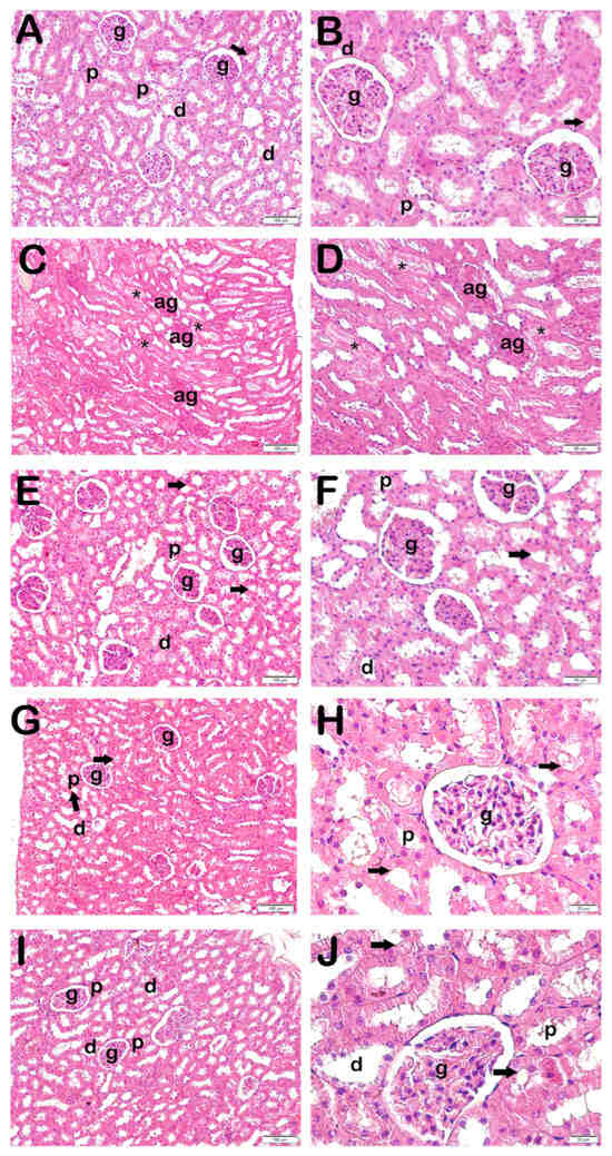 Representative light microscopic image of kidney tissue stained with H&E. Proximal tubule (p), distal tubule (d), glomerulus (g), brush border (arrow), atypical glomeruli (ag), necrotic tubules accompanying debris accumulation in lumens (star). (A,B) Controls: Normal renal tubule and glomerulus (g) structures can be seen. Brush border in proximal tubule has a typical structure (arrow) (KHDS: 0.5 (0–1)). (C,D) X-ray irradiation group: Widespread atypical glomeruli (ag) and necrotic tubules accompanying debris accumulation in lumens (asterisk) (KHDS: 6.5 (6–7)). (E,F) AMF treatment group: Decreases can be seen in degenerative glomeruli and necrotic tubules (KHDS: 1.0 (1–3)). (G,H) Dex 100 µg treatment group: Decreases can be seen in necrotic tubules accompanying debris accumulations in lumens and atypical glomerular structures (KHDS: 1.0 (1–2)). (I,J) Dex 200 µg treatment group: Tubules and glomerular structures are typical in appearance (KHDS: 1.0 (1–1)).
