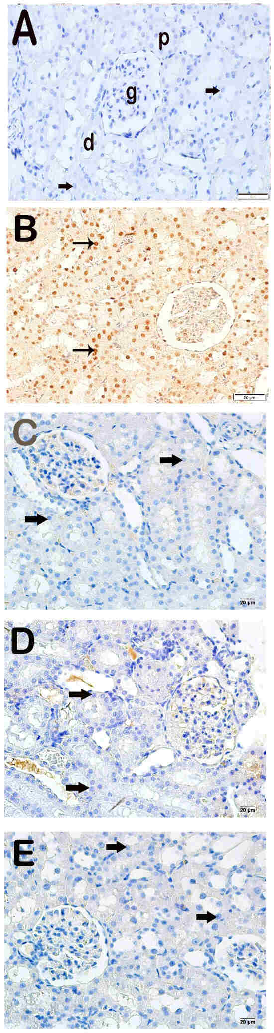 Representative light microscopic appearance of kidney sections incubated with cleaved Caspase-3. Proximal tubule (p), distal tubule (d), glomerulus (g). (A) Control group: Normal renal tubule epithelial cells (arrow). (Cleaved Caspase-3 positivity score: 0.0 (0–1)). (B) X-irradiation group: Intense cleaved Caspase-3 positivity in apoptotic renal tubule epithelial cells of (tailed arrow) (Cleaved Caspase-3 positivity score: 2.50 (2–3)). (C) X-irradiation + AMF treatment group: The number of cells showing Cleaved Caspase-3 positivity was decreased in renal tubule apoptotic epithelial cells (tailed arrow) (cleaved Caspase-3 positivity score: 0.50 (0–1)). (D) X-irradiation + Dex 100 µg treatment group: Cleaved Caspase-3-positive cells have decreased in renal tubule epithelial cells (tailed arrow) (cleaved Caspase-3 positivity score: 0.00 (0–1)). (E) X-irradiation + Dex 200 µg treatment group: Cleaved Caspase-3-positive cells have decreased in typical renal tubule epithelial (tailed arrow) (cleaved Caspase-3 positivity score: 0.00 (0–1)).