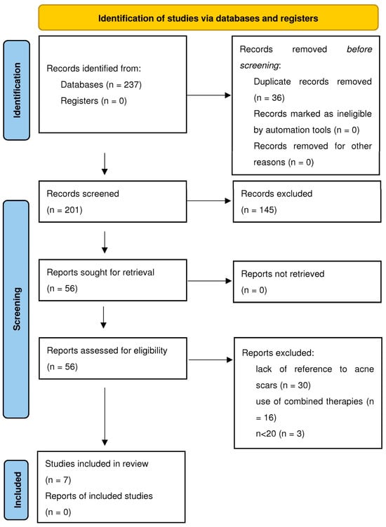 Search results (PubMed n = 140, Google Scholar n = 97, total n = 237) → After removing duplicates (n = 201) → After rejection based on abstracts (n = 56) → After rejection due to lack of reference to acne scars, use of combined therapies or n < 20 (n = 7) (Figure 1).