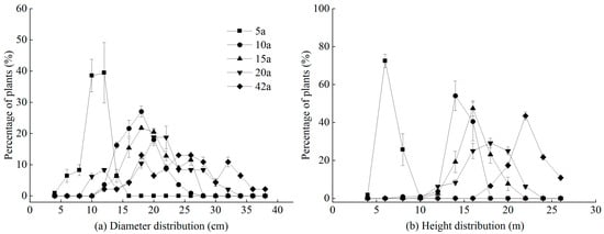 Diameter structure (a) and height structure (b) of Michelia macclurei plantations at different forest ages.