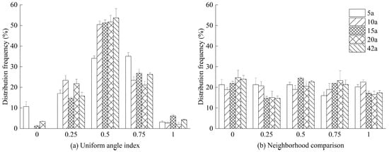 Distribution frequencies of uniform angle index (a) and neighborhood comparison (b) of Michelia macclurei plantations at different forest ages.