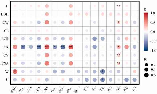 Correlation analysis of structure and soil physical and chemical properties of Michelia macclurei plantations of different ages. Note: soil bulk density: SBD; soil water content: SWC; soil total porosity: STP; soil capillary porosity: SCP; soil non-capillary porosity: SNP; saturated water-holding capacity: SMC; capillary water-holding capacity: SCC; non-capillary water-holding capacity: SNC; soil organic carbon content: SOC; total nitrogen: TN; total phosphorus: TP; total potassium: TK; alkali-hydrolyzable nitrogen: AN; available phosphorus: AP; available potassium: AK; soil pH: pH; crown width: CW; crown length: CL; live crown ratio: LCR; crown projection ratio: CR; crown volume: CV; crown surface area: CSA; uniform angle index: W; neighborhood comparison: U; tree height: H; diameter at breast height: DBH; *: p < 0.05; **: p < 0.01.