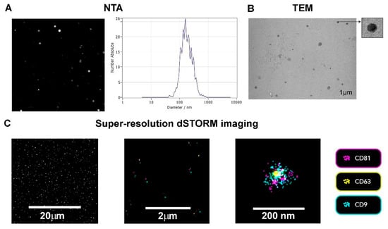 To better characterize the vesicles at a single-EV level, TEV morphology and co-localization of tetraspanins were assessed using TEM and super-resolution dSTORM microscopy. TEM confirmed the presence of electron dense structures, characteristic for EVs, with preserved integrity (Figure 1B), while the super-resolution imaging confirmed the expression of EV markers on TEV surface (Figure 1C). According to CODI analysis, 39% of the TEVs were triple positive, whereas 92.5%, 51.8%, and 78.9% of TEVs were single positive for CD9, CD63, or CD81, respectively.