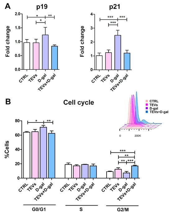 Accumulation of DNA damage due to OS activates DNA damage response pathways, including the p19–p53 pathway and its downstream target, p21, which inhibit the cyclin-dependent kinase (CDK)-dependent phosphorylation of Rb (retinoblastoma protein), leading to cell cycle arrest at the G0/G1 phase [42]. This prevents further multiplication of damaged cells, where the cells remain metabolically active but no longer proliferate [43]. D-gal exposure induced upregulation of CDK inhibitors p19 and p21, indicating that the keratinocytes are undergoing cellular stress leading to senescence. On the other hand, TEV pretreatment considerably prevented this effect, while TEVs alone did not induce a significant change in the protein level of these senescence markers (Figure 3A).