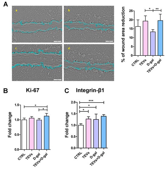 Next, to examine the effect of TEV pretreatment on some of the putative mechanisms underlying “wound” closure, we analyzed the expression Ki-67, a widely used proliferation marker [50]. The protein level of Ki-67 was higher in the cells pretreated with TEVs and exposed to D-gal than in the other experimental groups (Figure 5B). This difference was statistically significant only when compared to the control cells and those exposed to D-gal only (Figure 5B).