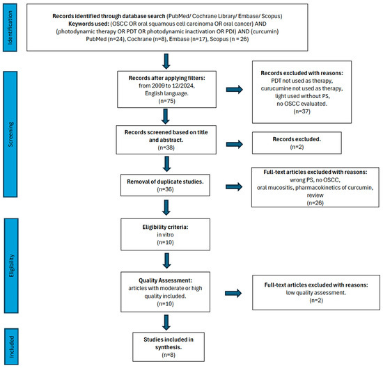 Chicago/Turabian StyleKubizna, Magdalena, Jakub Fiegler-Rudol, Wojciech Niemczyk, and Rafał Wiench. 2025. "The Efficacy of Curcumin-Mediated Photodynamic Therapy in the Treatment of Oral Squamous Cell Carcinoma: A Systematic Review of In Vitro Studies" Life 15, no. 6: 924. https://doi.org/10.3390/life15060924