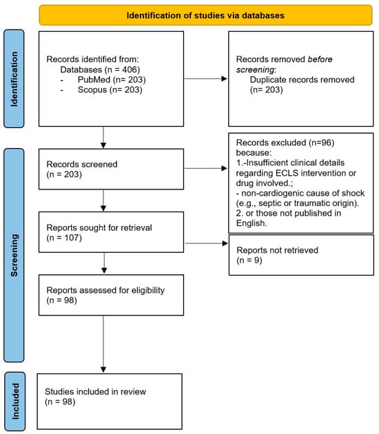 Eligible sources included observational studies (prospective or retrospective), case series with at least three patients, and well-documented case reports describing the use of ECLS in the context of cardiotoxic drug poisoning. Systematic reviews and meta-analyses were screened to identify additional relevant primary studies. Outcomes of interest included survival, recovery of cardiac function, duration of extracorporeal support, ECLS-related complications, and pharmacokinetics parameters, when available. Exclusion criteria comprised studies addressing non-cardiogenic forms of shock (e.g., septic, distributive, or hypovolemic), cases of cardiogenic shock unrelated to pharmacological causes (e.g., acute coronary syndromes, viral myocarditis, trauma, or congenital heart disease), and poisonings without significant myocardial depression (e.g., paracetamol, methanol, or non-cardiotoxic pesticides). Additionally, experimental studies on animal models or in vitro systems without translational relevance, as well as editorials, commentaries, opinion pieces, letters without original data, and duplicate publications, were excluded. When multiple publications were derived from the same dataset, only the most comprehensive or most recent version was retained. Studies lacking sufficient clinical detail, such as the specific drug involved, the rationale for ECLS initiation, the modality of support, or relevant outcome data, were also excluded. After applying these criteria, 203 articles were initially identified. Following title and abstract screening, 107 were selected for full text review. Ultimately, 98 studies were included based on methodological and scientific quality (Figure 1).