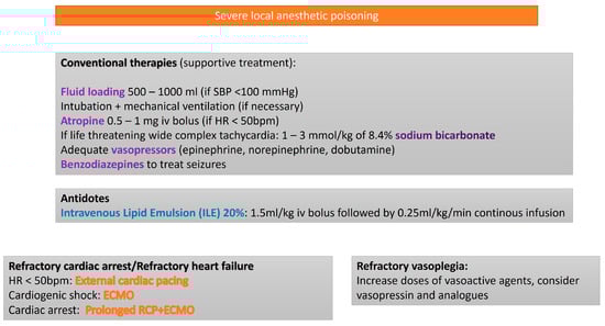 - Weinberg, G.L. Treatment of local anesthetic systemic toxicity (LAST). Reg. Anesth. Pain. Med. 2010, 35, 188–193. [Google Scholar] [CrossRef] [PubMed]