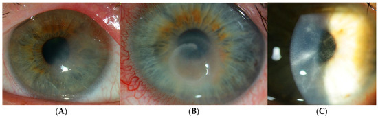 Patients with early AK have nonspecific symptoms, such as tearing, redness, blurred vision, and mild discomfort. A distinguishing symptom with disease progression is intense pain, especially with increasing inflammation [28,29]. Most AK are unilateral, with only 7.5–11% reported bilateral AK, which mostly affects contact lens wearers [30,31,32,33]. Co-infection is also relatively common, such as with Pseudomonas species, which is the most common bacterial infection in contact lens wearers, and can affect up to 23% of AK cases [33,34]. Early clinical signs within the first fortnight of AK can include conjunctival follicular inflammation and subepithelial opacities, mimicking adenoviral conjunctivitis; epithelial defects and pseudodendritic epithelial changes that mimic herpes simplex keratitis [29,35]. Other signs can include microcysts and epithelial microerosions. Limbitis can occur due to direct Acanthamoeba invasion or as a result of the host s immune response.