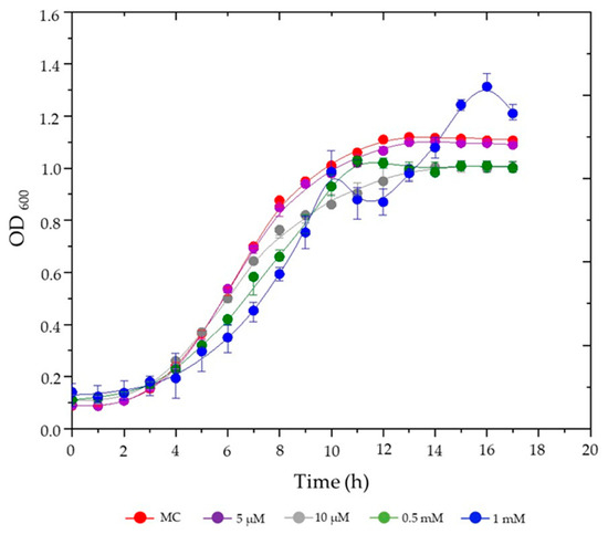 The growth dynamics of S. plymuthica were evaluated in liquid culture media supplemented with various concentrations of hemin (5 µM, 10 µM, 0.5 mM, and 1 mM) compared to the heme-free control medium (MC) (Figure 1).