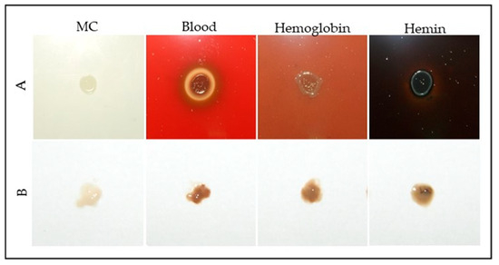 For solid medium assays, three sets of conditions were tested: (1) Hemin supplementation—Hemin (Sigma-Aldrich, St. Louis, MO, USA) was dissolved in 0.1 M NaOH and buffered with phosphate-buffered saline (PBS; 0.5 M NaH2PO4, 0.5 M Na2HPO4, 0.15 M NaCl, pH 7.4); (2) Inorganic iron supplementation—Ferric chloride and ferrous sulfate were dissolved in distilled water; (3) Blood derivatives—Defibrinated blood (4%) and hemoglobin (4 mg·mL−1, solubilized in sterile distilled water) were added to autoclaved medium when cooled to 55–60 °C.