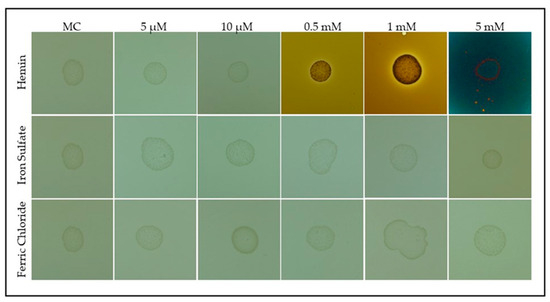To compare the effects of heme and inorganic iron sources, bacterial growth was evaluated on modified CASO medium supplemented with either hemin or iron salts (ferric chloride and iron sulfate) (Figure 3).