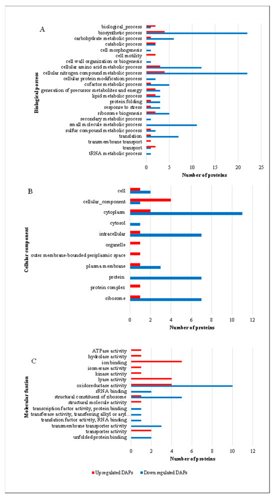 Functional classification of differentially abundant proteins (DAPs) in S. plymuthica under heme stress. Proteins differentially abundant in S. plymuthica cultured in the presence of heme were classified based on Gene Ontology (GO) annotations into (A) Biological Processes, (B) Cellular Components, and (C) Molecular Functions. The number of proteins associated with each category is represented by bar length. Red bars indicate upregulated proteins, while blue bars indicate downregulated proteins. Heme exposure was associated with prominent downregulation of proteins involved in translation, ribosome biogenesis, and redox functions, and the upregulation of proteins related to membrane transport and stress adaptation.
