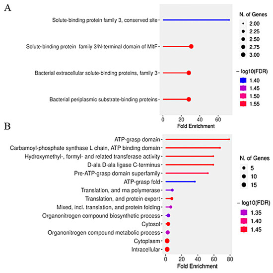 Functional enrichment analysis of differentially expressed genes in S. plymuthica exposed to 5 mM hemin revealed distinct biological processes associated with upregulated and downregulated genes (Figure 5). Upregulated genes (Figure 5A) were significantly enriched for solute-binding and periplasmic transport categories, including “solute-binding protein family 3, conserved site” (~60-fold enrichment), “solute-binding protein family 3/N-terminal domain of MITF,” “bacterial extracellular solute-binding proteins, family 3,” and “bacterial periplasmic substrate-binding proteins.” These findings indicate a strong activation of heme acquisition and transport mechanisms, consistent with the upregulation of ABC transporters and substrate-binding proteins identified in our proteomic analysis (Table 1).
