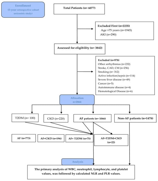 Patients who fulfilled the following criteria were included: patients aged between 18 and 75 years, diagnosed with AF, T2DM, and CKD. Due to their heterogeneity, as their values rise independently with age, particularly NLR [15], we excluded patients over 75 years old. The other exclusion criteria were as follows: other arrhythmias (such as atrial flutter or ventricular arrhythmia); acute kidney disease (AKI); primary factors for acute or chronic inflammation: active smoking, infections (like sepsis), and hematologic–oncological diseases (cancer and leukemia); severe liver disease; autoimmune diseases (systemic lupus erythematosus, rheumatoid arthritis); patients on steroid medication; pregnancy (n = 0). Additional comorbidities such as obesity were also documented. The flow chart diagram in Figure 1 displays the study design, process, and number of patients selected.