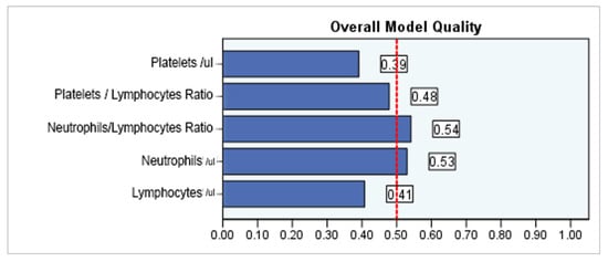 In AF with CKD, all five biomarkers showed a statistically significant correlation. However, in this case, only NLR performed best, followed by the neutrophil level and PLR value. For NLR the AUC coefficient is 0.646, with a sensitivity of 60.7% and a specificity of 66.0% for the identified cut-off value of 3.9804. The next highlighted marker is the neutrophil level, with an AUC coefficient of 0.623 for the cut-off value of 67,150, which has a moderate sensitivity of 69.4%, although the specificity is reduced, at only 53.5%, but it is still above the minimum threshold of acceptability. The PLR, although it has an AUC coefficient of 0.578, i.e., still above the limit of 0.5, has a sensitivity below the acceptability threshold (49.5%) and a better specificity (64.4%) for the cut-off value of 13.7553, Supplementary Materials (Table S18).