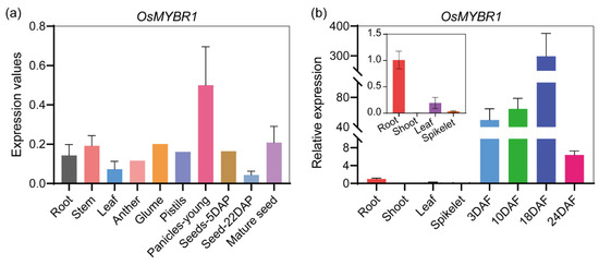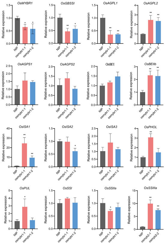 3.4. Mutation of OsMYBR1 Affects the Expression of SSEGs