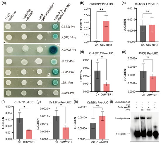 3.5. OsMYBR1 Regulates Six SSEGs by Directly Binding to Their Promoters