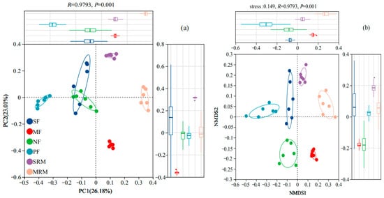 The beta diversity of soil bacterial communities across different land-use types was assessed using Principal Coordinate Analysis (PCoA) and Non-Metric Multidimensional Scaling (NMDS) based on OTU composition (Figure 1). Both PCoA (Figure 1a) and NMDS (Figure 1b) plots clearly separated bacterial communities according to land-use types, indicating distinct bacterial assemblages associated with specific land-use practices and ecological conditions. In the PCoA analysis (Figure 1a), the first two principal coordinates explained 36.84% and 19.35% of the variation, respectively, accounting for 56.19% of the total community variation. Bacterial communities from MRM and MF formed distinct clusters on the ordination plot, confirming their compositional divergence from other sites. In contrast, PF, NF, and SF samples grouped more closely, indicating relatively similar microbial communities under forested and agricultural land-use types. Consistently, the NMDS analysis (Figure 1b) further supported these findings, clearly grouping bacterial communities by land-use type and highlighting significant differences in community composition among MRM, MF, and other land use categories. Wetland restoration sites (MRM, SRM) were notably distinct from actively cultivated agricultural soils (SF, MF) and forest ecosystems (NF, PF), reflecting substantial ecological divergence associated with wetland restoration and land-use management practices.