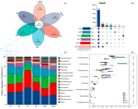 Relative abundance of soil bacterial phyla across land-use types. Abbreviations: SF, soybean farmland; MF, maize farmland; NF, natural forest; PF, plantation forest; SRM, soybean-retired meadow wetland; MRM, maize-retired marsh wetland. (a): Venn diagram of soil microorganisms based on the level of OTUs; (b): Upset map; (c): Relative abundance of soil bacterial communities under different land uses at the phylum level. (d): Statistical comparison of the top eight most abundant bacterial taxa. Significance levels: *** p < 0.001. Sample size: n = 6 for each land-use type.
