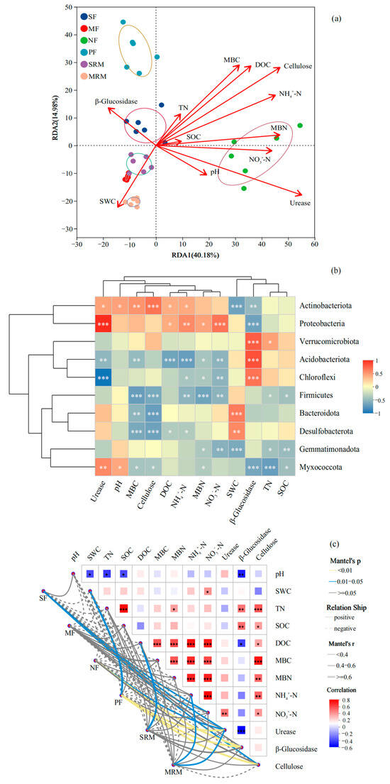Relationships between microbial community composition and soil properties based on RDA (a), heatmap (b), and Mantel test (c). Mantel test significance was evaluated at α = 0.05. Asterisks indicate significance levels: * p < 0.05; ** p < 0.01; *** p < 0.001. Abbreviations, SF, soybean farmland; MF, maize farmland; NF, natural forest; PF, plantation forest; SRM, soybean-retired meadow wetland; MRM, maize-retired marsh wetland; pH, soil pH value; SOC, soil organic carbon; SWC, soil water content; TN, total nitrogen; DOC, dissolved organic carbon; MBC, microbial biomass carbon; MBN, microbial biomass nitrogen; NH4+-N, ammonium nitrogen; NO3−-N, nitrate nitrogen. Sample size: n = 6 for each land-use type.