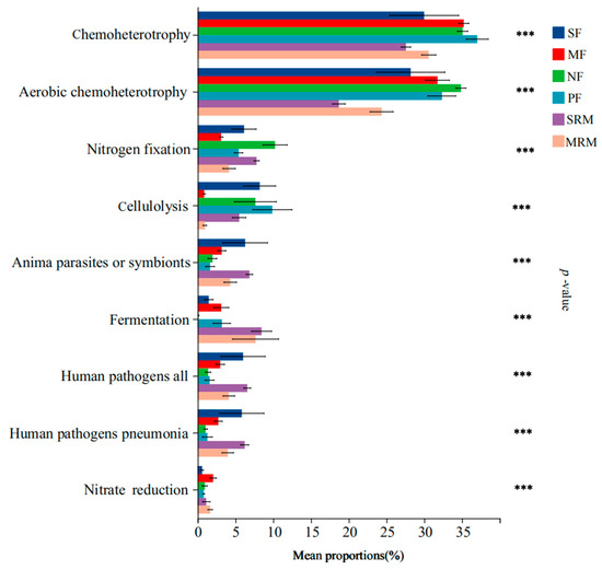 FAPROTAX-based functional prediction across land-use types. Note: significance levels: *** p < 0.001. Abbreviations, SF, soybean farmland; MF, maize farmland; NF, natural forest; PF, plantation forest; SRM, soybean-retired meadow wetland; MRM, maize-retired marsh wetland. Sample size: n = 6 for each land-use type.