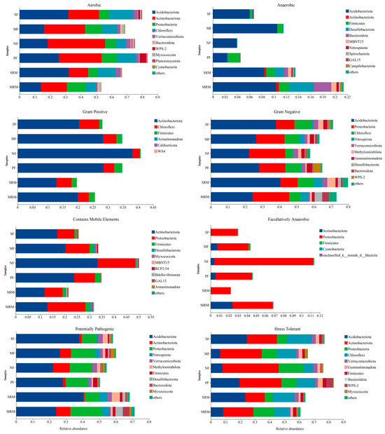 The phenotypic abundance analysis of eight types of bacteria (aerobic, anaerobic, Gram-positive, Gram-negative, contains mobile element, facultatively anaerobic, potentially pathogenic, and stress-tolerant) predicted by BugBase based on different land use patterns is presented in Figure 5. Soil aerobic metabolism functions were mainly dominated by Acidobacteriota and Actinobacteriota, with notable differences among land-use types. Actinobacteriota contributed most to aerobic functions in SF, MF, NF, and PF, but was relatively lower in SRM and MRM. Anaerobic metabolism-associated bacteria showed the highest relative abundances in SRM and MRM, mainly contributed by Acidobacteriota, Firmicutes, Desulfobacterota, Bacteroidota, and Actinobacteriota. Compared to wetlands and agricultural soils, forest soils (NF, PF) exhibited lower anaerobic metabolic potential. For Gram-positive phenotypes, Actinobacteriota contributed most in SF, MF, SRM, and MRM, but less in NF and PF. Gram-negative bacteria dominated across all sites, with the highest relative abundances observed in SF and SRM, primarily driven by Proteobacteria and Acidobacteriota. Proteobacteria and Actinobacteriota were the major contributors to the bacterial communities that contain mobile elements. Among the different land-use types, NF exhibited the highest relative abundance of bacteria harboring mobile genetic elements, whereas SRM showed the lowest. Facultatively anaerobic bacteria were primarily contributed by Proteobacteria. Among the different sites, NF had the highest relative abundance, while SRM showed the lowest. The potentially pathogenic bacterial communities were mainly contributed by Acidobacteriota and Proteobacteria. Wetland restoration soils (SRM, MRM) exhibited higher relative abundances of potentially pathogenic bacteria compared to agricultural (SF, MF) and forest soils (NF, PF). Among all sites, SRM showed the highest abundance of potentially pathogenic taxa. The data show that Proteobacteria, Actinobacteriota, and Chloroflexi were the dominant contributors to the stress-tolerant phenotype, with slightly higher proportions in forest soils (FW, AFL) than in agricultural (SS, RS) and wetland restoration soils (MR, MS).