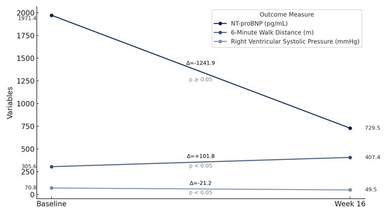 A follow-up period of 16 weeks was selected for its established relevance and precedence in PH research. Notably, the INCREASE study, the largest to date in PH-ILD, demonstrated significant results at 16 weeks, which led to FDA approval of inhaled treprostinil for this indication. Furthermore, 16 weeks is a widely utilized evaluation period in PH trials, providing sufficient time to assess treatment efficacy and safety meaningfully [9,12,13]. A one-sample t-test was used to assess the significance of mean changes in clinical and functional outcomes after 16 weeks of selexipag treatment (α = 0.05; n = 8), with analyses performed in Python 3.11 as this approach is appropriate for evaluating within-group changes in the absence of a comparator arm.