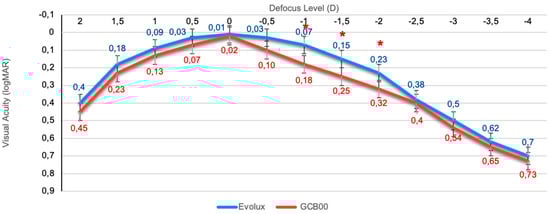 Comparison between mean defocus curves in the IOL groups (logMAR). * p-values for −1.00 D, −1.50 D, and −2.0 D are statistically significant (0.038, 0.023, and 0,035, respectively).