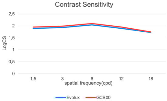 Figure 2 shows contrast sensitivity (CS) under photopic conditions. No statistically significant differences were found between the GCB00 IOL group and the Evolux IOL group across all spatial frequencies.