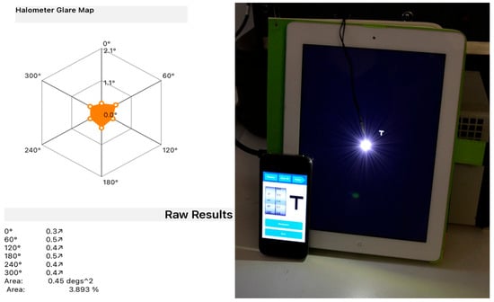 - Buckhurst, P.J.; Naroo, S.A.; Davies, L.N.; Shah, S.; Buckhurst, H.; Kingsnorth, A.; Drew, T.; Wolffsohn, J.S. Tablet App halometer for the assessment of dysphotopsia. J. Cataract Refract. Surg. 2015, 41, 2424–2429. [Google Scholar] [CrossRef] [PubMed]