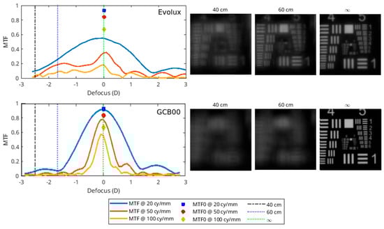 In Figure 4, we report the MTF as a function of defocus for three spatial frequencies: 20 cycles/mm (blue line), 50 cycles/mm (red line), and 100 cycles/mm (yellow line). As an upper limit, we also report the pure diffraction case (labelled as MTF0), with blue, red, and yellow markers in the focus. The three dashed vertical lines represent the values of the defocus that correspond to the far (infinite distance), intermediate (60 cm), and near (40 cm) vision. For these same vision distances, the images of the USAF are shown for the two IOLs, providing visual information about the contrast degradation of the image. In both cases, the power of the IOL is 21 D and the pupil size is 3.0 mm. The results show a larger depth of field with Evolux IOL, providing better performance for the near-intermediate vision compared to the GCB00 IOL. The GCB00 IOL instead presents a better contrast preservation in distance vision.