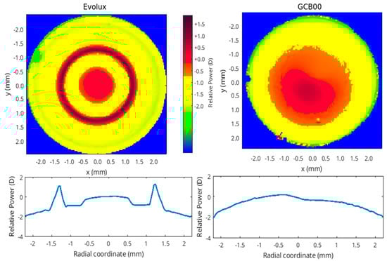 Figure 5 shows the power map of the IOLs with the same power (21 D). The scale is relative to the central value. The characteristics both in shape and in the range of the power show the differences in the two IOLs, in agreement with the optical performances shown in Figure 4. In fact, the large range of power values in the Evolux IOL results in a larger depth of field compared to the GCB00. Furthermore, the power map reflects the optical/geometric design of the two IOLs described in Section 2.3. The GCB00 has a nearly constant power in the central part with a periphery aspheric region with a negative value that can compensate for the natural spherical aberration to obtain a true monofocal lens. The Evolux presents an alternate variation of power in the central part to give an enhanced depth of field that characterizes this IOL. In the lower part of Figure 5, the power is reported as a function of the radial coordinate obtained by averaging two perpendicular meridians.