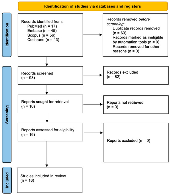 In accordance with the PRISMA 2020 guidelines, the process of study selection is outlined in Figure 1. The systematic search across multiple databases initially identified 161 records. After the removal of duplicates, 98 unique articles remained. Through screening of titles and abstracts, 16 studies were deemed potentially relevant and were selected for full-text review. All 16 studies met the inclusion criteria and were incorporated into the final analysis. These randomized controlled trials, all published within the last decade, specifically investigated the therapeutic efficacy of indocyanine green (ICG)-mediated photodynamic therapy in the management of periodontitis. Table 4 presents the geographical distribution of the included studies.