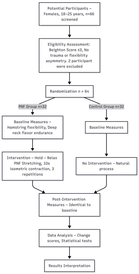 Aim: To assess the acute effects of proprioceptive neuromuscular facilitation (PNF), stretching was applied to the hamstring muscles to evaluate deep cervical flexor endurance. Potential variables correlating with endurance adaptations were examined. Methods: This randomized controlled trial performed between September 2023 and June 2024 included healthy female university students aged 18–25 years. Participants were randomly assigned to either the control or the PNF group. Variables included age, height, weight, body mass index, Beighton score, hamstring flexibility, and deep cervical flexor muscle endurance; correlations between changes in hamstring flexibility and DCF endurance were explored. Hamstring flexibility was assessed using the Passive Knee Extension Test, and deep cervical flexor endurance was assessed using the Cranio-Cervical Flexion Test. The PNF group received hold–relax exercises while controls did not receive any intervention. Results: The study included 32 control participants and 32 individuals in the PNF group. The PNF group was marginally but significantly older than the control group [22 (21–23) vs. 21 (21–22); p = 0.038]. At baseline, the PNF group showed greater hamstring flexibility (p = 0.010). Both groups showed significant improvements in hamstring flexibility (p < 0.001 for both), but the improvement in the PNF recipients was far greater (p < 0.001). Regarding deep neck flexor endurance, no significant difference was observed between the groups at baseline (p = 0.958) or in final measurements (p = 0.244), although both groups showed significant improvements from baseline (p < 0.001 for both). There were no significant correlations between the change in deep neck flexor endurance and any of the examined variables. Conclusions: Our study found that a single session of PNF stretching significantly improved hamstring flexibility but did not immediately enhance deep neck flexor endurance. This emphasizes the need for further research into longer-term interventions to assess whether interventions on hamstring flexibility can improve cervical function.