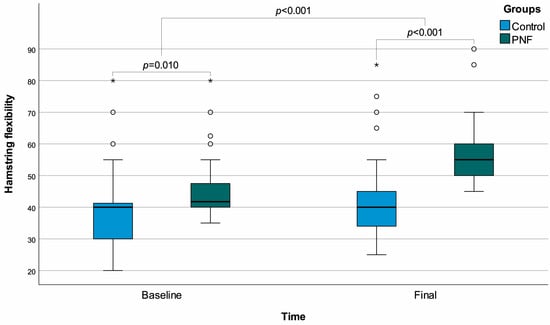 A total of 64 participants were included, with 32 assigned to the control group and 32 to the PNF group. No participant withdrawals were observed throughout the study duration. There was a minor but significant difference in age between the control and PNF groups, with a median age of 21 (21–22) in controls and 22 (21–23) in PNF recipients (p = 0.038). In terms of hamstring flexibility, the baseline values differed between the groups, with the PNF group showing a higher initial value (p = 0.010). In the final measurements, a significant increase was observed in the PNF group (p < 0.001), and both groups exhibited significant improvements (p < 0.001 for both) (Figure 2).