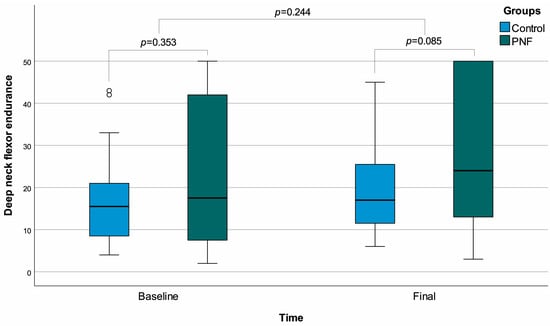 However, when evaluating the change in flexibility, the increase was far greater in PNF recipients compared to controls (p < 0.001). Regarding deep neck flexor endurance, no significant difference was found between the groups in baseline or final measurements, although both groups demonstrated significant improvements over time (p < 0.001 for both). The changes in endurance were also similar in the two groups (p = 0.244) (Table 1) (Figure 3).