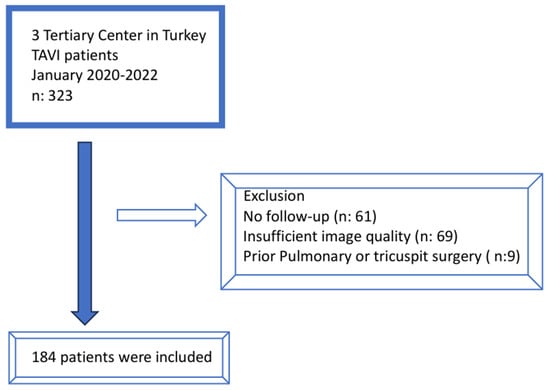 The data of 323 patients who underwent TAVI for severe symptomatic AS between January 2020 and January 2022 were analysed. Sixty-one patients without a 1-year follow-up, sixty-nine patients with poor-quality pre-procedural tomography, and nine patients who had previously undergone tricuspid valve surgery were excluded from the study (Figure 1). The clinical characteristics, Euroscore 2 scores, and baseline echocardiographic and tomographic measurements of 184 patients were evaluated.