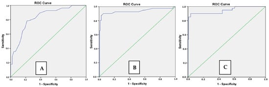 ROC curves representing the relationship between the right ventricular damage markers and one-year mortality: (A) Pulmonary artery diameter; (B) right ventricular outflow tract thickness; (C) maximal right and left ventricular diameter ratios.