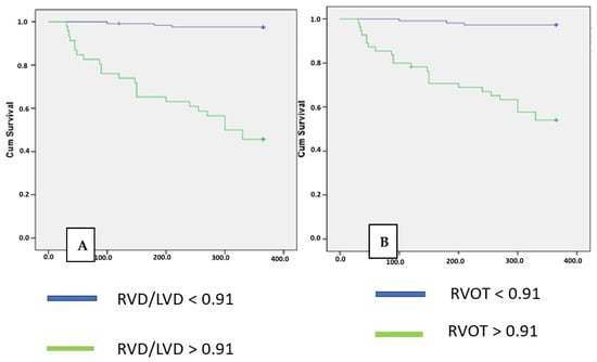 In the Kaplan–Meier analysis, it was demonstrated by the log rank that an RVOT myocardial thickness of 4 mm or greater and maximal RVD/LVD ratios of 0.91 or greater significantly predicted one-year mortality (p < 0.001) (Figure 4).