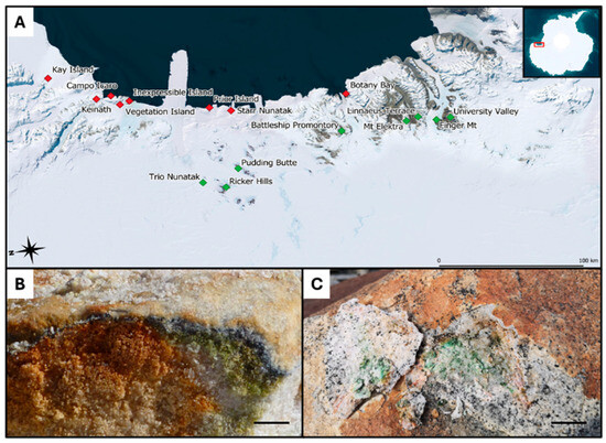 (A) Map displaying the 16 sites in Victoria Land (Antarctica) from which the 21 endolithically colonized granite (red squares) and the 24 endolithically colonized sandstone (green squares) samples were taken; (B) sandstone-associated endolithic communities (picture by Laura Selbmann); (C) granite-associated endolithic microbial communities with visible colonization of Lecidea cancriformis on the surface. Reproduced with permission from Stoppiello et al., 2025, Polar Biology; published by Springer, 2025 [17]. Scale bars: (A) 100 km; (B,C) scale bar 1 cm.