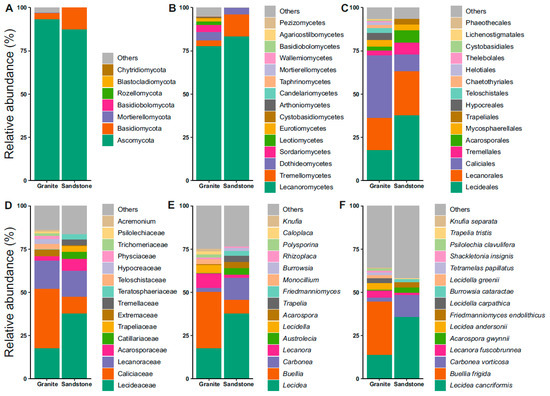 Relative abundance plots of fungi. (A) Phylum, (B) class, (C) order, (D) family, (E) genus, and (F) species reported for each of the granite and sandstone substrates.