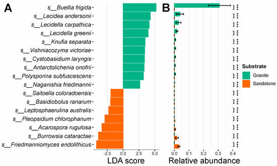 The effect size of the separation between the granite and sandstone fungal diversity analyses showed species with the highest discriminatory power between the two types of rocks substrate. Statistically significant results (LDA > 2, p-value < 0.001) are reported in the Supplementary Materials (Table S1). The fungal species with higher segregative values and statistically higher abundance between the two groups are as follows: Buellia frigida, Lecidea andersonii, Lecidella carpathica, Lecidella grenii, Knufia separata, Vishniacozyma victoriae, Cystobasidium laringis, Antarctolichenia onofrii, Polysporina subfuscescens and Naganishia friedmanii for granite, and Friedmmanniomyces endolithicus, Burrowsia cataractae, Acarospora rugulosa, Pleopsidium chlorophanum, Leptosphaerulina australis, Basidiobolus ranarum and Saitoella coloradoensis for sandstone (Figure 3A,B).