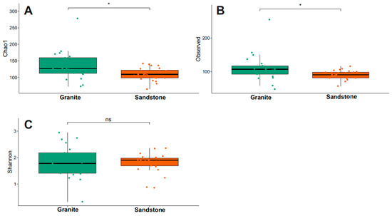 Comparison of alpha diversity using Chao1, Observed and Shannon indexes of fungi (A–C) between granite and sandstone substrates. Statistical support was tested via the Wilcoxon test, indicated as * p < 0.05. ns = not statistically significant.