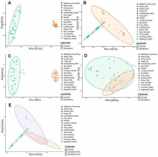 The Jaccard and Bray–Curtis indexes, and unweighted UniFrac and weighted UniFrac distances, were used to assess the beta diversity and the differences in fungal assemblages among the two types of substrates. The differences between granite and sandstone are significant (p-value < 0.001) when selecting specific species for each rock type (31% and 41% r2, respectively) and when using presence/absence-based metrics (Jaccard and unweighted UniFrac) (Figure 5A,C). However, when abundance is considered (Bray–Curtis and weighted UniFrac), the geographic location or the sandstone geology (40% and 41% r2) appear to have a greater influence on diversity than rock type (14% and 11% r2) (Figure 5B,D; Supplementary Table S1). Additionally, we observed a significant difference between the Beacon sandstone Supergroup from the southern sites and sedimentary rocks collected in Northern Victoria Land (p-value < 0.001). This finding supports the greater heterogeneity among sandstone sites when using abundance-based metrics (Bray–Curtis, weighted UniFrac) (Figure 5E).