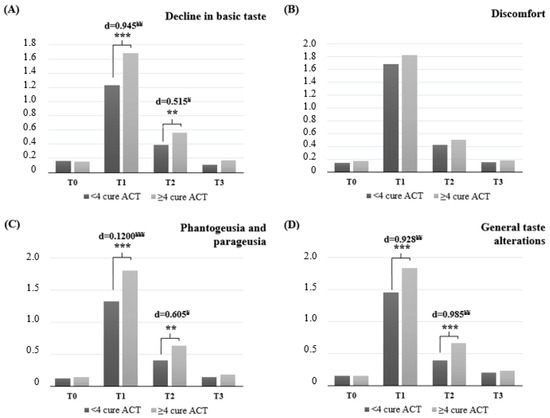 Figure 1 presents the trajectory of ACT-induced TAs, as assessed by the CiTAS, throughout treatment and follow-up. All CiTAS subscale scores increased significantly in both treatment groups at the end of chemotherapy (T1) compared to baseline (T0) (p < 0.001). At the 3-month follow-up (T2) and 6-month follow-up (T3), subscale scores declined significantly compared to T1 (p < 0.001), although scores at T2 remained significantly elevated relative to baseline (T0–T2; p = 0.01). A further significant decrease was observed between T2 and T3 (p = 0.01). By T3, there were no significant differences between subscale scores and baseline levels in either group. Notably, the subscales ‘Decline in Basic Taste’, ‘Phantogeusia and Parageusia’ and ‘General Taste Alterations’ demonstrated significantly higher scores in patients receiving ≥4 cycles of ACT compared to those receiving <4 cycles, both at T1(mean ± SD: 1.68 ± 0.82, 1.81 ± 1.00, and 1.84 ± 0.94 vs. 1.23 ± 0.59, 1.33 ± 0.78, and 1.46 ± 0.72, respectively; p < 0.001 for all) and at T2 (0.56 ± 0.24, 0.63 ± 0.28, and 0.66 ± 0.31 vs. 0.39 ± 0.15, 0.40 ± 0.18, and 0.39 ± 0.16, respectively; p < 0.001 for General Taste Alterations and p < 0.05 for Decline in Basic Taste and Phantogeusia and Parageusia). Effect sizes at T1 were large to very large (Cohen’s d = 0.945 for Decline in Basic Taste, 0.946 for Phantogeusia and Parageusia, and 0.946 for General Taste Alterations), while at T2 effect sizes ranged from medium to large (d = 0.515, 0.605, and 0.985, respectively). Although all subscale scores remained higher at T3 in the ≥4 cycle group, the differences were not statistically significant. Additionally, no significant differences in total or subscale CiTAS scores were observed between genders at any time point.