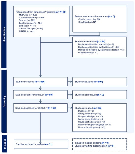 The PRISMA flow diagram of the included and excluded studies, along with their characteristics, is shown in Figure 1. The literature search resulted in a total of 1066 studies after the removal of duplicates and ineligible studies using the automation tool in Covidence. Of these studies, 997 were excluded after title and abstract screening. Full-text screening was performed on the remaining 69 studies, from which a further 38 articles were excluded. Reasons for their exclusion can be seen in the PRISMA flowchart (Figure 1). Therefore, a total of 22 published full-text papers and 9 abstracts were included in this review. These 31 articles and abstracts were published between 1990 and 2024. One of the records (Casson 2014 [21]) included a follow-up study, making the total number of studies 32. A summary of the 32 included studies can be seen in Table 1.